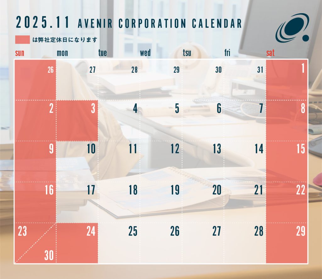 日ごろより株式会社アヴェニールをご愛顧いただき、厚く御礼申し上げます。11月の営業日を下記通りご案内いたします。何卒ご理解賜り、引き続きお引き立てのほどよろしくお願い申し上げます。 NEWS 10月の営業日のご案内